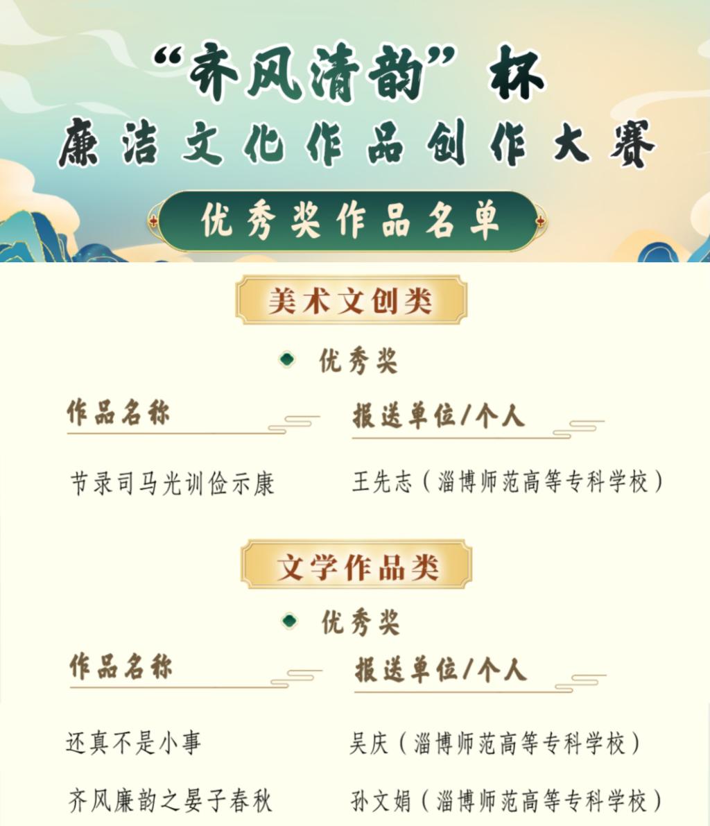 在廉洁戏剧类评选中,由淄博师专与淄博市文化馆、淄博市演艺中心联合报送的《光亮》获评全市优秀廉洁剧目,其中学前教育学院教师卢石磊参与该作品创作;美术文创类方面,书法作品《节录司马光训俭示康》由美术系教师王先志报送,成功摘得优秀奖;文学作品类中,美术系党总支书记吴庆的《还真不是小事》、人文学院教师孙文娟的《齐风廉韵之晏子春秋》双双荣获优秀奖。获奖作品涵盖戏剧、书画、文学等多个领域,创作实力得到充分认可。